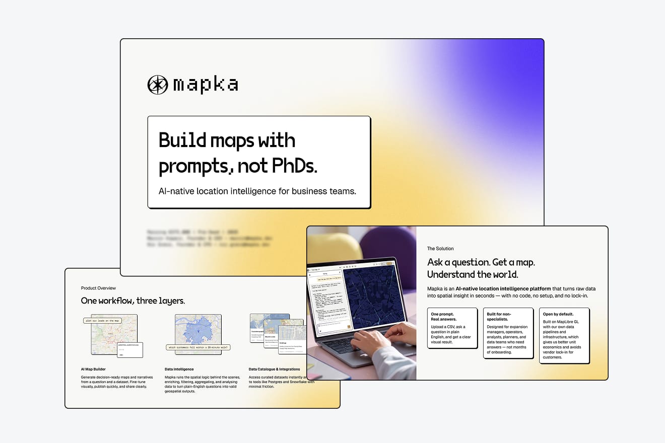 Mapka is an AI-native mapping startup built to make map creation more accessible. I joined in September 2025, when the company was still at proof-of-concept stage, to help turn an ambitious technical idea into something more coherent: a clearer product, a stronger brand, and a more credible investor story.